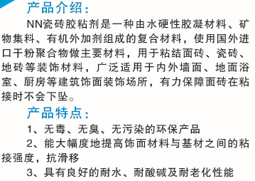 用量標準:每平方4-6公斤(根據瓷磚的大小,重量調節用量)綜合用料比用傳統水泥30%-40%。