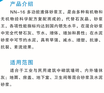 該產品除具有一般砂漿王優異的工作性能以外,還具有保濕、和易、增稠、擴散水泥、提高流平性、不沁水、不離析、減少坍落度經時損失、降低勞動成本、環保無塵、提高功效等功能,還可以進一步降低購買成本,方便實用,易儲存,減少浪費